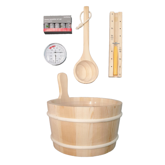 The Yakia Sauna Accessory Kit is the perfect addition to elevate your sauna experience. With essentials like a wooden bucket and liner, wooden ladle, and thermometer, it ensures safe and traditional sauna use, allowing you to easily manage heat and humidity.